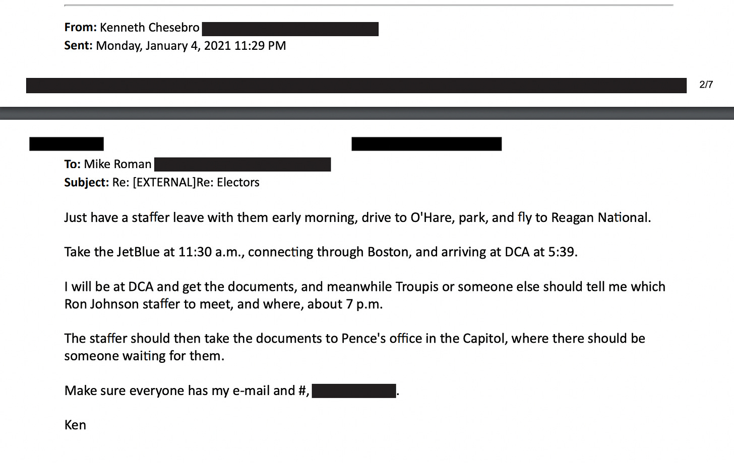 If you’ve been reading Civil Discourse for a while, you’re familiar with these men, at least with Chesebro and Roman, and possibly with Troupis as well. Some background on Roman is here, and it’s worth revisiting after you finish tonight’s newsletter. I’ve written about Chesebro repeatedly, most recently here amid speculation he might be cooperating. And interestingly enough there is a single email that emerges from all of this that connects all three of them. Here it is. This is Chesebro, writing to Roman, talking about providing the fake elector ballots to Mike Pence through the good graces of Wisconsin Senator Ron Johnson, with Troupis to identify which of Johnson’s staffers they should speak with. This is a solid case, in some ways, even a paper case. As we’ve all seen recently, the documents don’t lie.