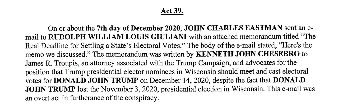 It’s fascinating to see these three indicted together in Wisconsin. Chesebro and Roman are both charged in the Fulton County, Georgia, case. Troupis is not, but he’s mentioned twice in the indictment. The first time is in Overt Act 39 in the RICO charge, which identifies Troupis as “an attorney associated with the Trump campaign” to whom Chesebro wrote a memo advocating for Trump “elector nominees” in Wisconsin to meet and cast ballots for Trump on December 14, 2020—the core conduct of the fake elector scheme.