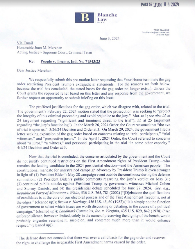 This evening, Trump asked Justice Merchan to end the gag order in the Manhattan case. Trump argues that since the trial is over, there is no longer a reason to keep it in place. Trump’s letter reads like a suggestion that his First Amendment rights are more important than the safety of the people involved in the trial, from court and prosecution personnel to witnesses to jurors. Of course it does.