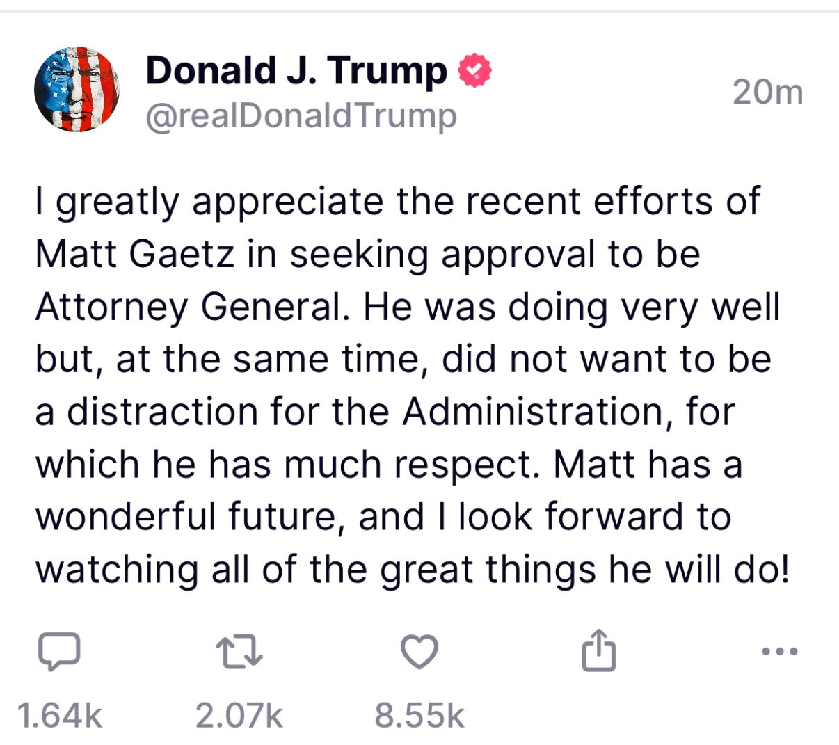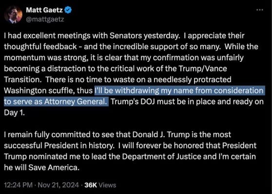Matt Gaetz, who withdrew his name from consideration as the next Attorney General of the United States today, had previously resigned from the House of Representatives. At the time, he claimed it was to facilitate the confirmation process, but of course, we knew immediately that it was to prevent the release of a bipartisan House Ethics Committee report on allegations he had used illegal drugs and had sex with a minor.