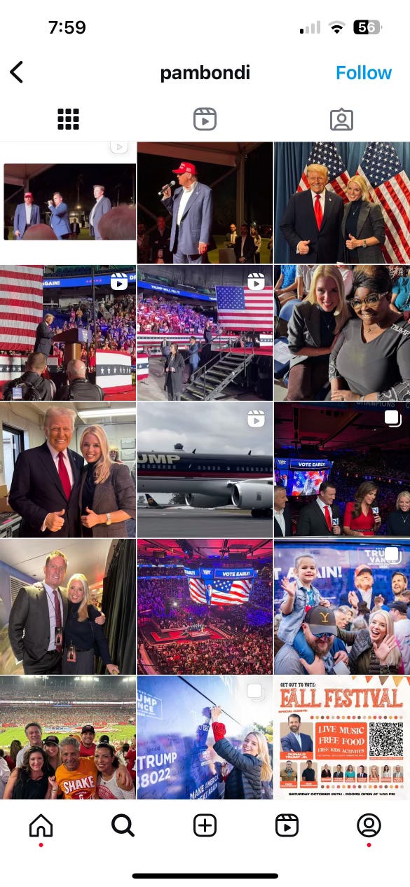 A friend texted me this photo with the message, “I found Pam’s resume. Oh wait, it’s her Instagram. My bad.” I have been trying so hard to avoid sliding into snark, but this collage certainly reflects Bondi’s application to be Donald Trump’s Attorney General.