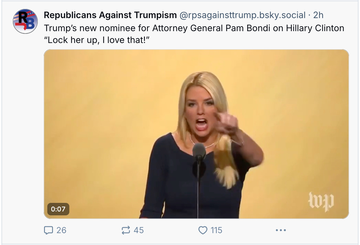 Bondi isn’t Gaetz. Gaetz was completely unqualified to be the Attorney General of the United States. It wasn’t a close call; it wasn’t a normal nomination. Bondi looks more “normal” on the surface, and she has the kind of experience you look for for a position like this. But even if she can competently handle 98% of the Department’s work—the national security cases, violent crime, drugs, sex trafficking, white collar cases, and so on—it’s the 2% that we have to be worried about. She accepted Trump’s Big Lie about the 2020 election even though her experience suggests she knows it wasn’t true. What happens when Trump asks her to engage in revenge prosecutions? Will she have the grit to say no? As someone who doesn’t come from DOJ, will she understand the importance of independence, or might she permit Trump to have direct contact and influence over criminal cases?