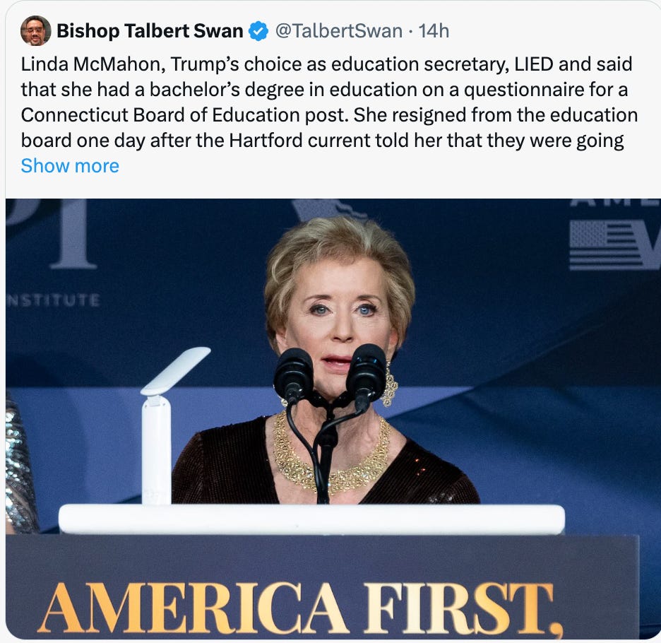 One other nomination may be in danger too. I haven’t seen this confirmed yet; by the time you read the newsletter, it probably will be one way or the other, but there were social media posts claiming Trump’s nominee to lead the Department of Education, Linda McMahon, lied about having a college degree in education when seeking a position on the Connection Board of Education. She reportedly resigned a day before she was going to be exposed in the press. If this is true, it’s disqualifying and will be yet another test for the Senate.