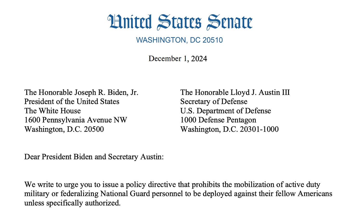 “We write to urge you to issue a policy directive that prohibits the mobilization of active duty military or federalizing National Guard personnel to be deployed against their fellow Americans unless specifically authorized. The Posse Comitatus Act ‘outlaws the willful use of any part of the Armed Forces to execute the law unless expressly authorized by the Constitution or an act of Congress.’”