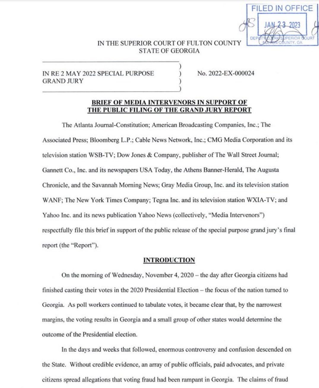 “The public interest in the report is extraordinary,” the motion says. “The court should file the report in the public docket and publish it ... as the special purpose grand jurors have requested.” The parties, which include the Atlanta Journal-Constitution but also the AP, Bloomberg, the New York Times, the Wall Street Journal, USA Today, and many others, as well as television stations, remind the court, which likely needs no reminders at this point, that the special grand jurors requested that the report be released to the public.