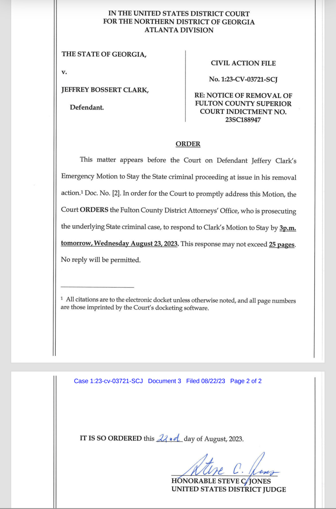 But Clark must have missed it. The federal judge to whom all three of the removal petitions are assigned, Steve Jones, seems to be on track for a summary disposition, rejecting Clark’s request. The Judge gave Fani Willis until 3 p.m. Wednesday to respond and will not permit Clark to file a reply to her argument.