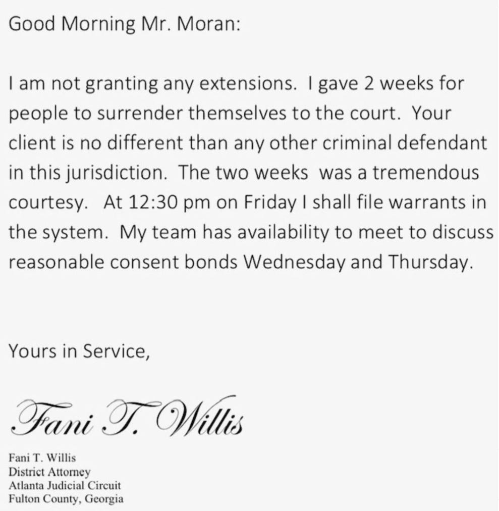 Clark is also affronted by the news that Fani Willis has obtained a warrant for his arrest that she will execute if he doesn’t turn himself in in a timely fashion. He complains that he “only learned about the arrest warrants based on press accounts.” Surely he is more fortunate than defendants who are arrested without any notice, an experience he had a taste of when an early-morning search warrant on his residence left him standing in front of his house in a pair of shorts.