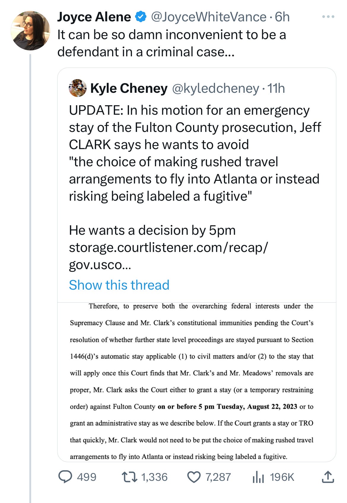 On Monday, Clark filed a notice of removal, an effort to get his case into federal court. At the same time, he filed something called “Defendant Jeffrey B. Clark’s Emergency Motion to Confirm Applicability of the Automatic Stay Under 28 U.S.C. 1446(D) or the Triggering of the Stay in 28 USC 1455(B)(5) or Both — Or in the Alternative For an Administrative Stay.” What this comes down to is an effort by Clark to avoid having to turn himself in by Fani Willis’s Friday deadline for defendants to present themselves for processing or be arrested.