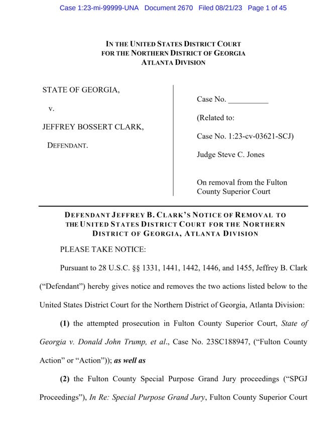 Count on Jeffrey Clark, the Trump-era Assistant Attorney General for the Environment and Natural Resources Division who wanted to be Attorney General, to file the strangest motion so far of any of Trump’s co-defendants in Georgia. Mark Meadows and at least one additional defendant, David Shafer, who was among the Georgia fake electors, want to have their cases moved from state court to federal court. But Clark takes the cake.
