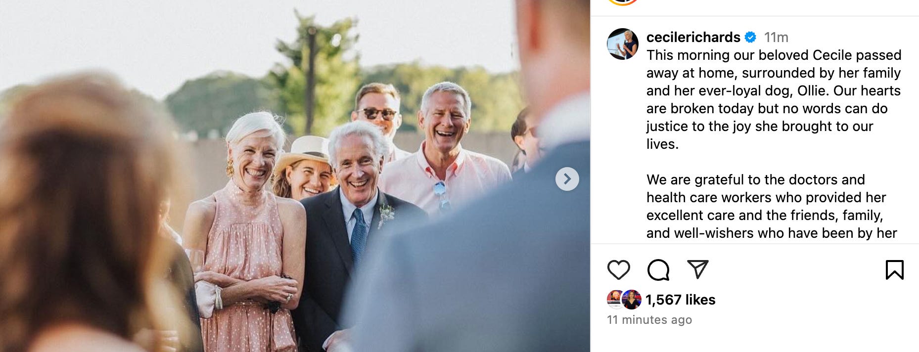 This morning, Cecile Richards, who fought for the rights of American women as the president of Planned Parenthood, passed away. Our lives as women, as families, as Americans are so much better because she was a part of them. She was wise, fearless, and relentless; really the best of us, unafraid to champion an often unpopular issue—women’s ability to make their own choices about their own bodies—that put her at personal risk.