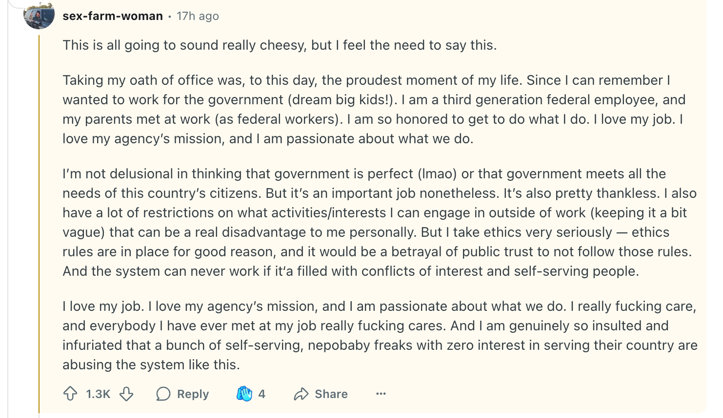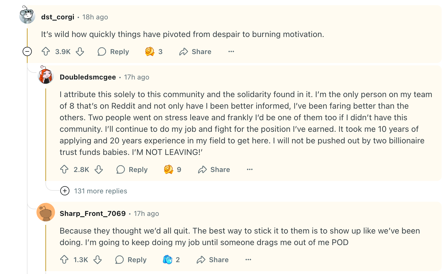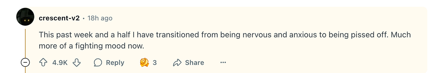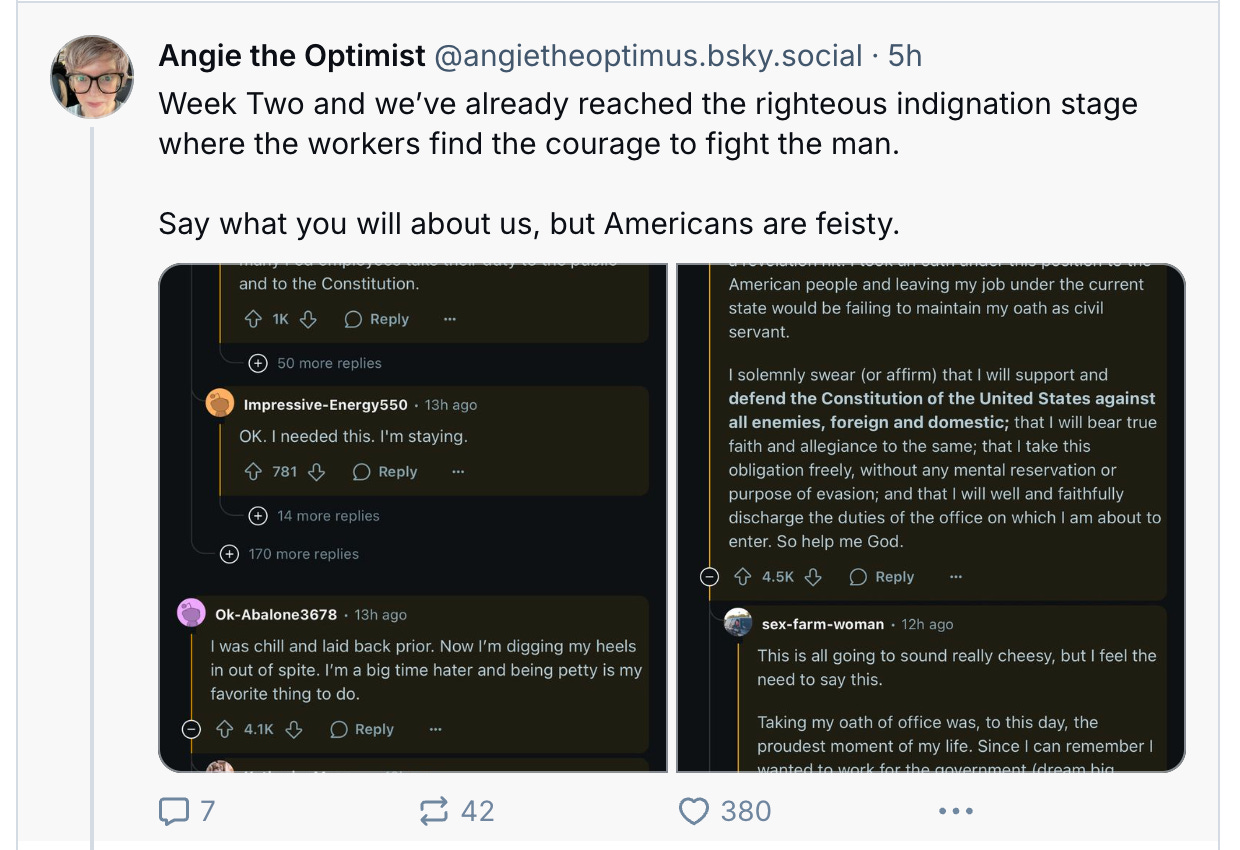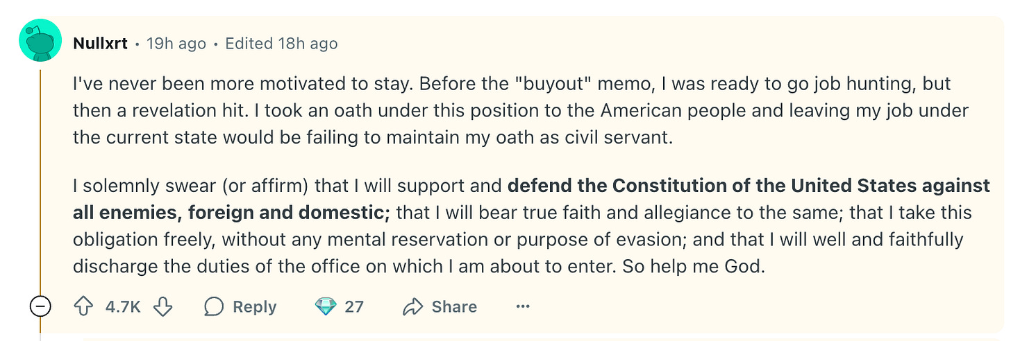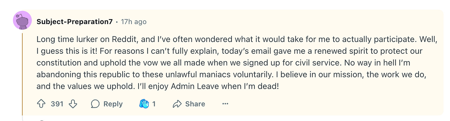 If you’re not familiar with Reddit, one of my kids described it to me as being “very useful for getting answers to questions,” and said, “It is the epitome of what social media should be: boring and useful.” As you’ll see below, quirky usernames and colorful language both feature heavily on the site, and it was anything but boring last night on the federal employees subreddit, where a post titled, This non "buyout" really seems to have backfired took off. A common theme was the love and respect these employees have for their work and their service—and their desire to “hold the line.” Lots of people expressed the view that they were done with being afraid and ready to fight.