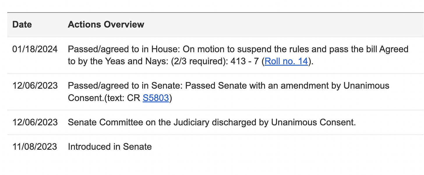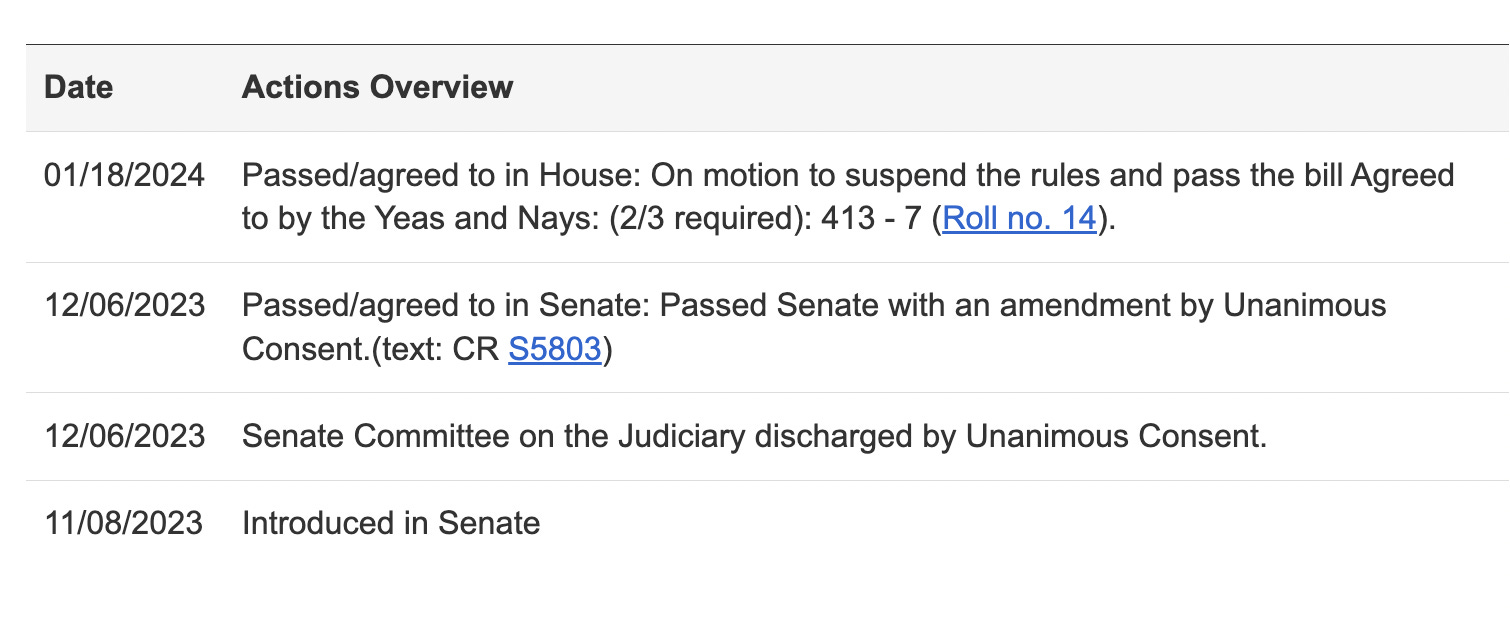 S. 3250 was introduced in the Senate on November 8, 2023, and it passed by unanimous consent on December 6, garnering little, if any, attention. Next, the bill moved to the House. Yesterday, it passed there. Now, all that’s left is for the Bill to go to President Biden’s desk for signature. Once that happens, the bill, as they say, will become a law.