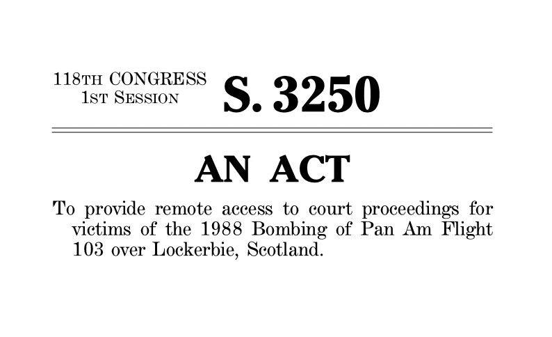 Here’s the deal: Senators John Cornyn, a Texas Republican, and Kirsten Gillibrand, a New York Democrat, cosponsored S. 3250, “An Act to provide remote access to court proceedings for victims of the 1988 Bombing of Pan Am Flight 103 over Lockerbie, Scotland.”