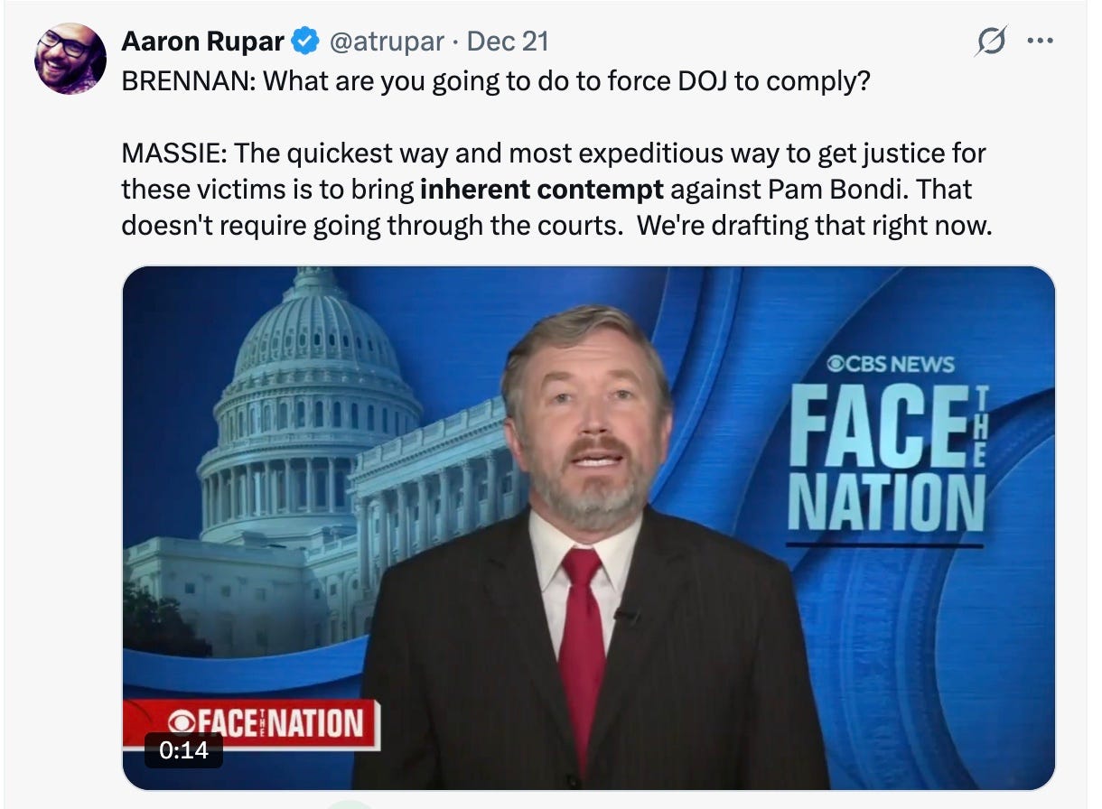 Khanna and Massey understand that if they seek civil enforcement, they’ll end up tied up in court. DOJ is not going to bring a criminal contempt case against Trump’s attorney general. Using inherent contempt, although it’s a throwback to almost one hundred years ago, would let the House go straight to holding Bondi accountable if a majority of Representatives vote for it—something that remains to be seen and may well turn on how strong public opinion is on the issue. The House doesn’t even need the Senate’s approval to do it.