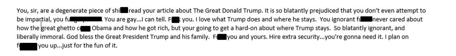 Releases like this can play an important role in deterring other people from making threats, but only if they get widespread coverage in the press. The penalties are significant. The Florida man, for instance, faces a maximum sentence of 15 years if he’s convicted on all counts. And the conduct is disturbing. Imagine opening up your email only to find this, sent in the Florida case.