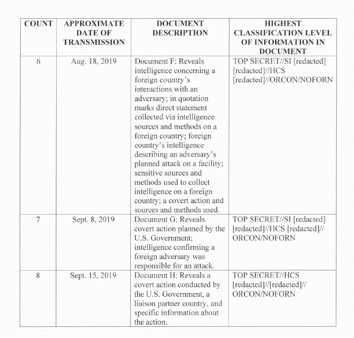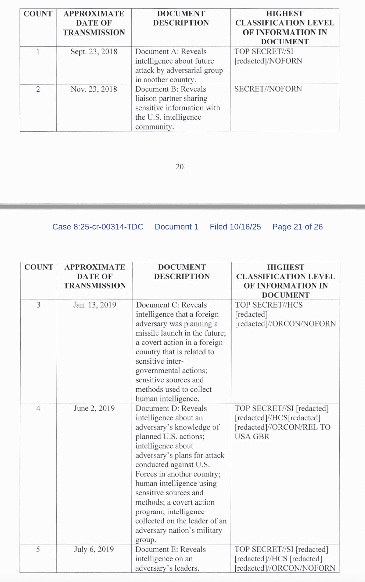 The indictment is entirely different from the two we’ve seen against Jim Comey and Letitia James out of the Eastern District of Virginia. For one thing, as we discussed earlier this week, the U.S. Attorney in Maryland is a career prosecutor. But she didn’t go into the grand jury to obtain the indictment. It’s signed off on by two senior prosecutors in her office as well as lawyers from DOJ’s National Security Division. Instead of the factually deficient indictments we’ve seen in the other cases, this is the sort of detailed indictment we are used to seeing in a serious matter. The factual predicate for the charges against Bolton is 20 pages, laid out in detail by professional prosecutors. Each count appears in a graph, as the first eight do here, with details about the documents involved.