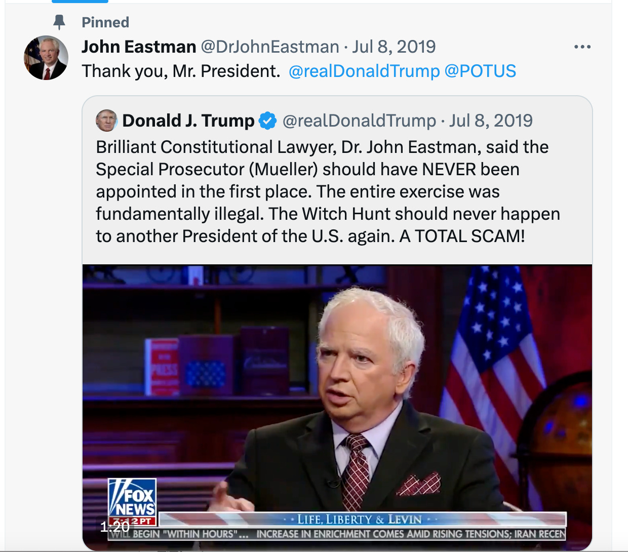 As if you need any more reminder of who John Eastman has always been, his pinned Tweet shows his fealty to Trump back during Mueller investigation days. If Trump says he’s brilliant, well golly, it must be the case. Eastman is firmly in Trump’s thrall—at least for now.