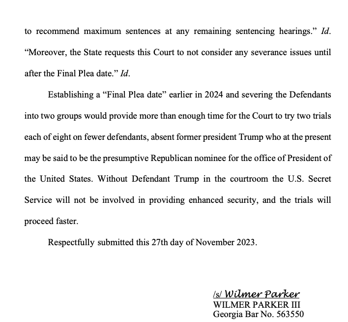 Eastman’s newest motion is awkwardly written. Although he doesn’t come out and say it, what he’s asking for is two separate trials for all remaining defendants, but not including Trump. Presumably Trump’s trial would happen alone, at some later date. Much later. After the election later.