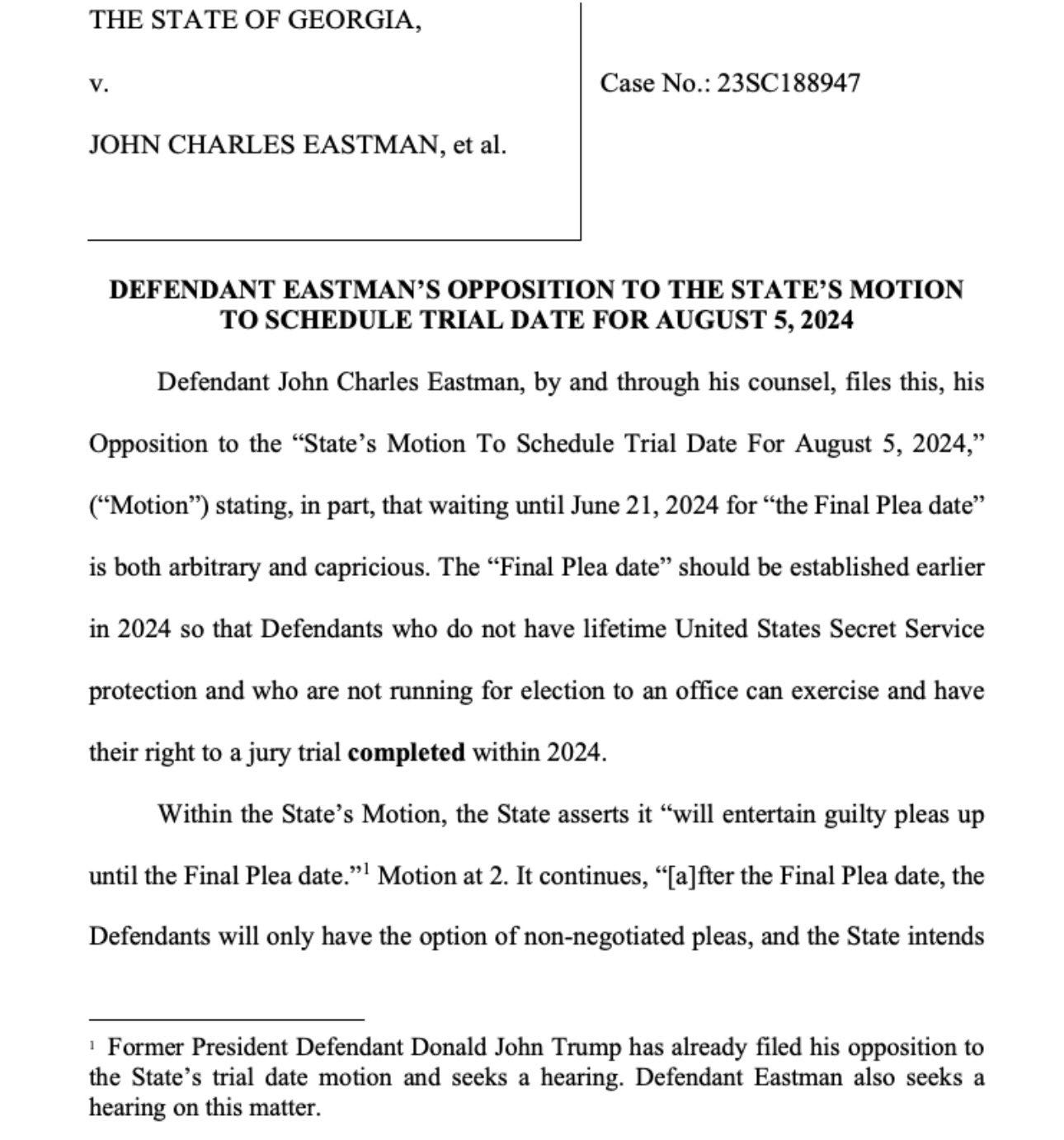 Eastman argues, “Without Defendant Trump in the courtroom the U.S. Secret Service will not be involved in providing enhanced security, and the trials will proceed faster.” There’s never been any reason to believe, or even the whiff of a suggestion, that having the Secret Service in the courtroom will slow down Willis’ presentation of the evidence. But of course, Eastman has always thought he knows best. He has “I’m the smartest guy in the room” syndrome written all over him.