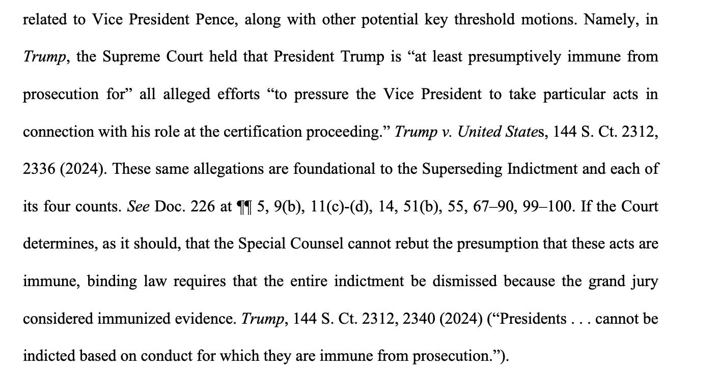 Smith writes in his brief, “the Government proposes that it file an opening brief in which it will explain why the immunity set forth in Trump does not apply to the categories of allegations in the superseding indictment or additional unpled categories of evidence that the Government intends to introduce at trial and will proffer in its brief. The Government’s proposed brief would provide the defendant and the Court with detailed information regarding the ‘content, form, and context,’ … of the defendant’s conduct, distinguish his private electioneering activity from official action, and rebut the presumption of immunity as to any conduct that the Court may deem official. Such a brief would position the defendant, in his response, to oppose the Government’s positions and raise any other immunity claims based on the superseding indictment and additional evidence set forth in the Government’s pleading.”