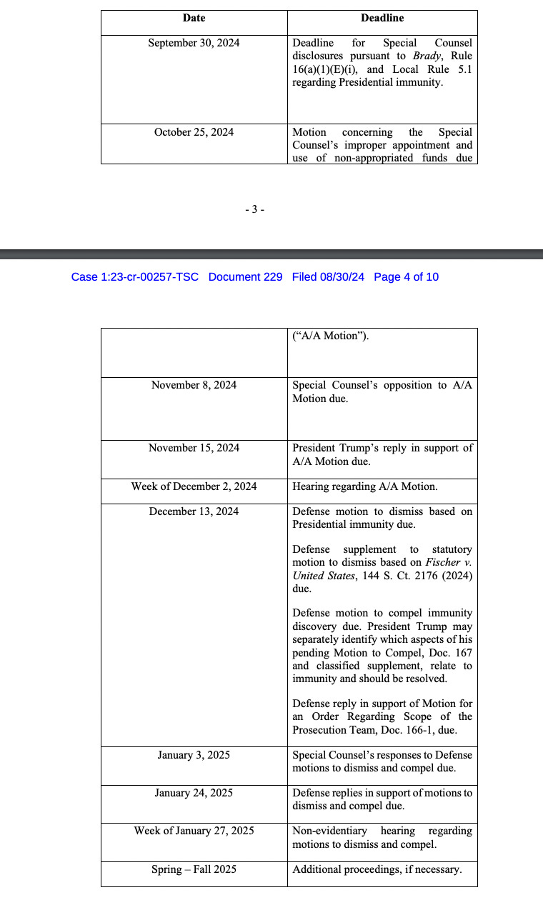 The briefing on that motion to dismiss would take up the remainder of November on Trump’s timeline, with a hearing the first week in December. The Special Counsel would not begin to explain to the court (and the public) why the charges in the superseding indictment are not barred by immunity—which will require, either in briefs or in evidentiary hearings, a discussion of what Trump did and what evidence the government has to prove it—until January 3, when Trump would have the Special Counsel file his first brief on the issue. If the court accepts Trump’s view, there would be no proceedings in court until January 27, 2025, a week after the inauguration.