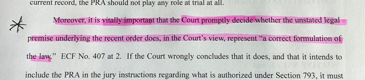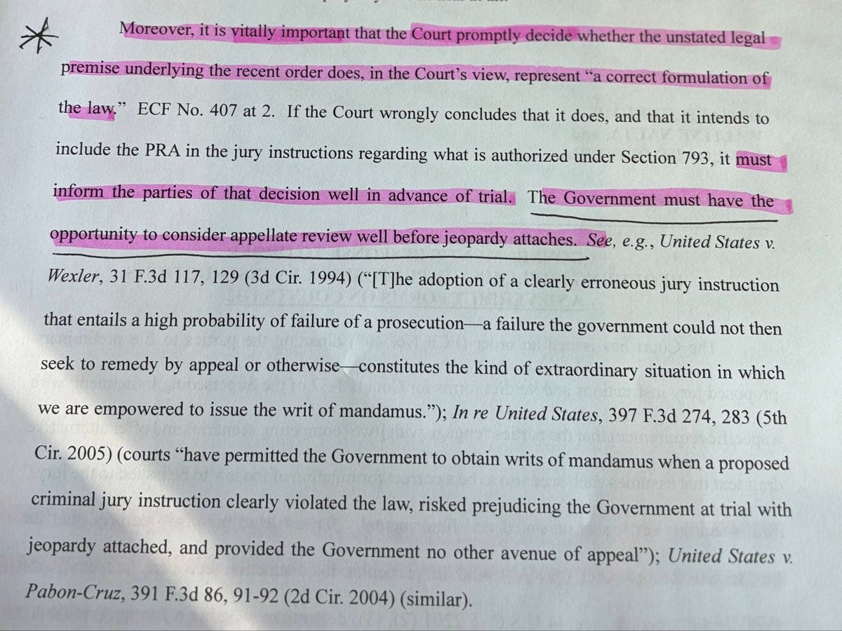 The Special Counsel isn’t buying it. If the Judge. sticks to this position—and we’ll get there in a second because it’s clearly an erroneous read of the law—it’s likely a death blow to the government’s case.