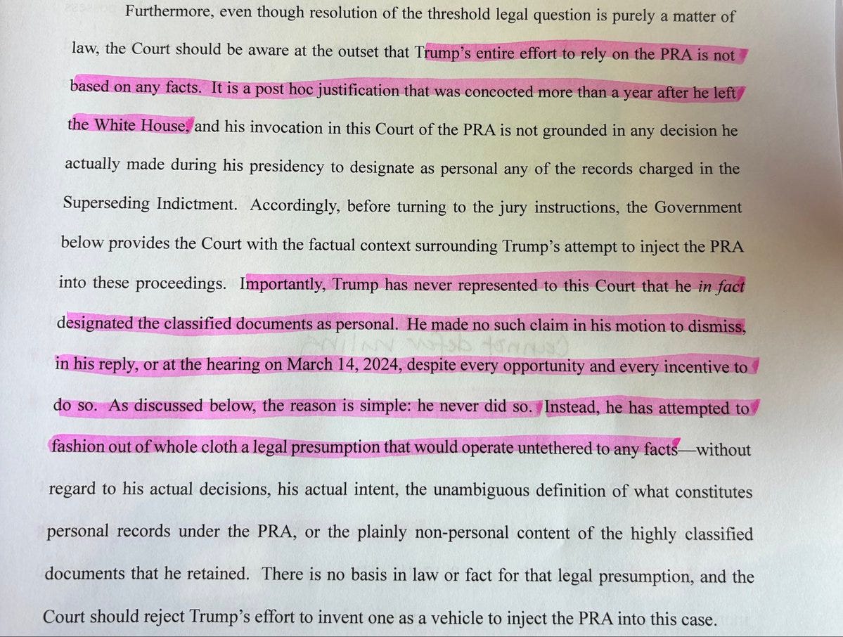 As for Trump, his lawyers also filed their jury instructions on Tuesday. They congratulated the Judge, claiming that “the Court has correctly stated the law in scenario (b) of the March 18 Order.” That’s the scenario that says no one can second-guess Trump. Once he says he designated a document as personal, that’s the ball game, and the prosecution is at an end.