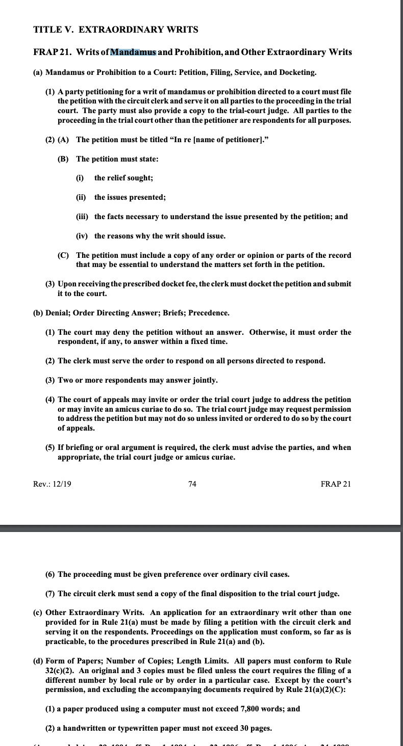 The Special Counsel lays out the case law that explicitly authorizes him to seek a writ of mandamus, something government lawyers only very rarely ask for. The law specifies that one of the rare circumstances where the writ can issue is to correct a district judge's decision to use clearly erroneous jury instructions that could lead to an unwarranted acquittal.