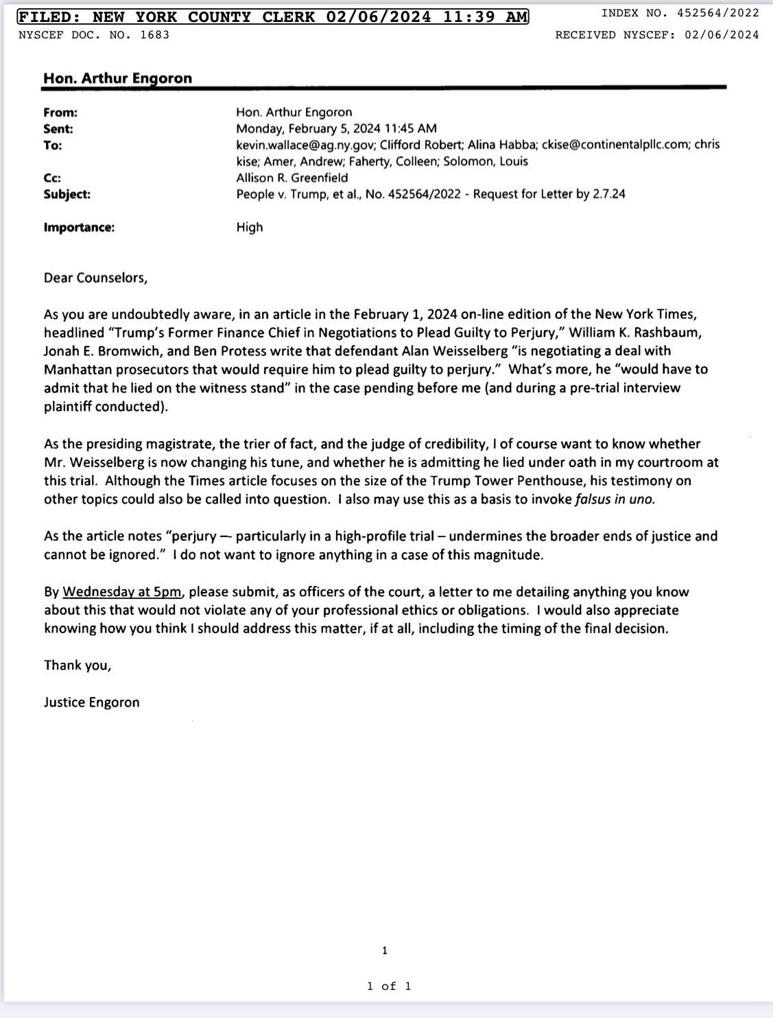There is so much going on today that it’s hard to stay on top of it all. So, I’ve got a rare afternoon newsletter for you. I’ll be back later tonight with an analysis of the Court of Appeals decision denying, as we expected, that former President Trump is entitled to immunity from all criminal prosecution. But I want to make sure we don’t miss the email Judge Engoron sent to counsel in the New York civil fraud case. We’ll take that up now.