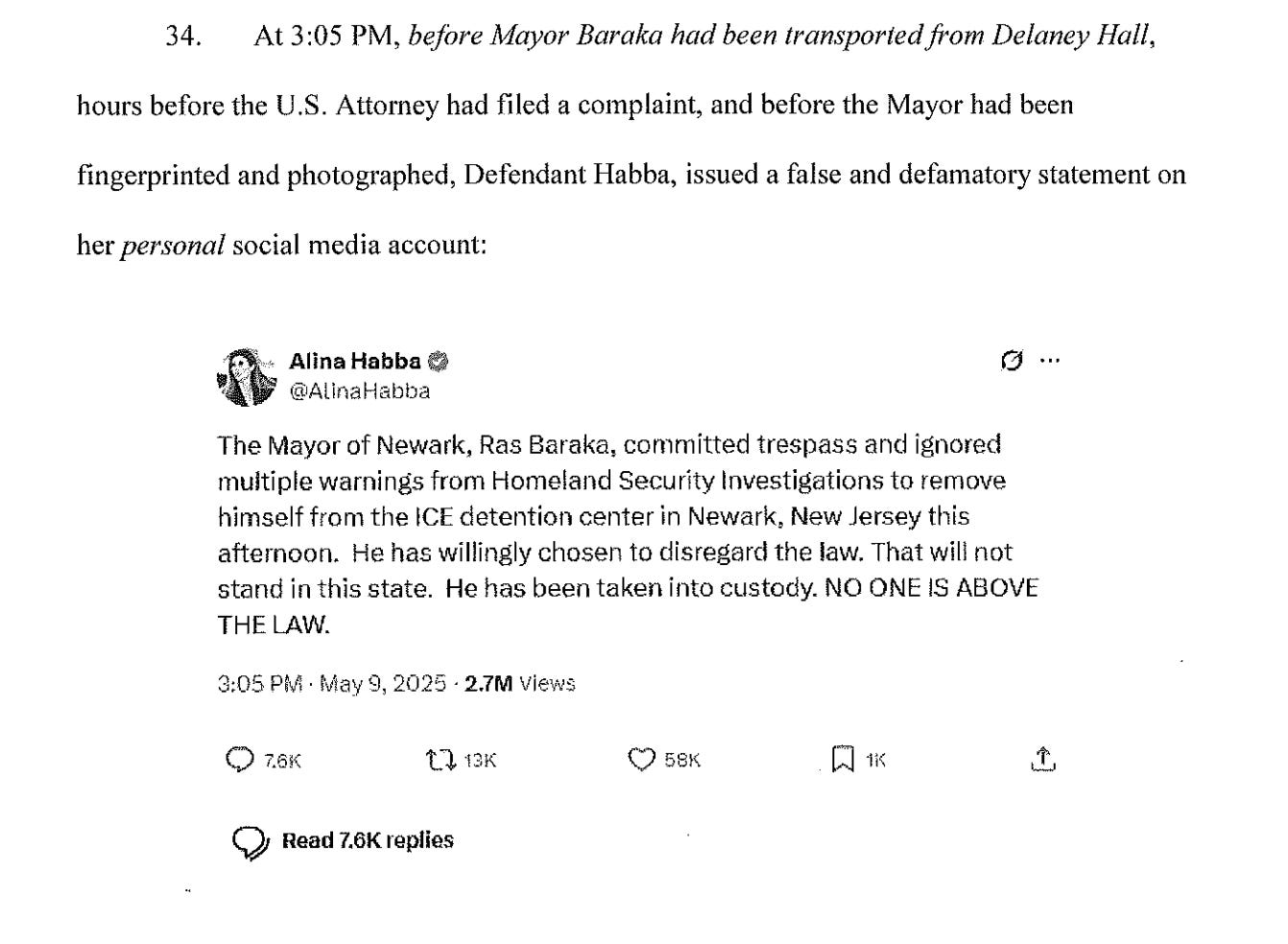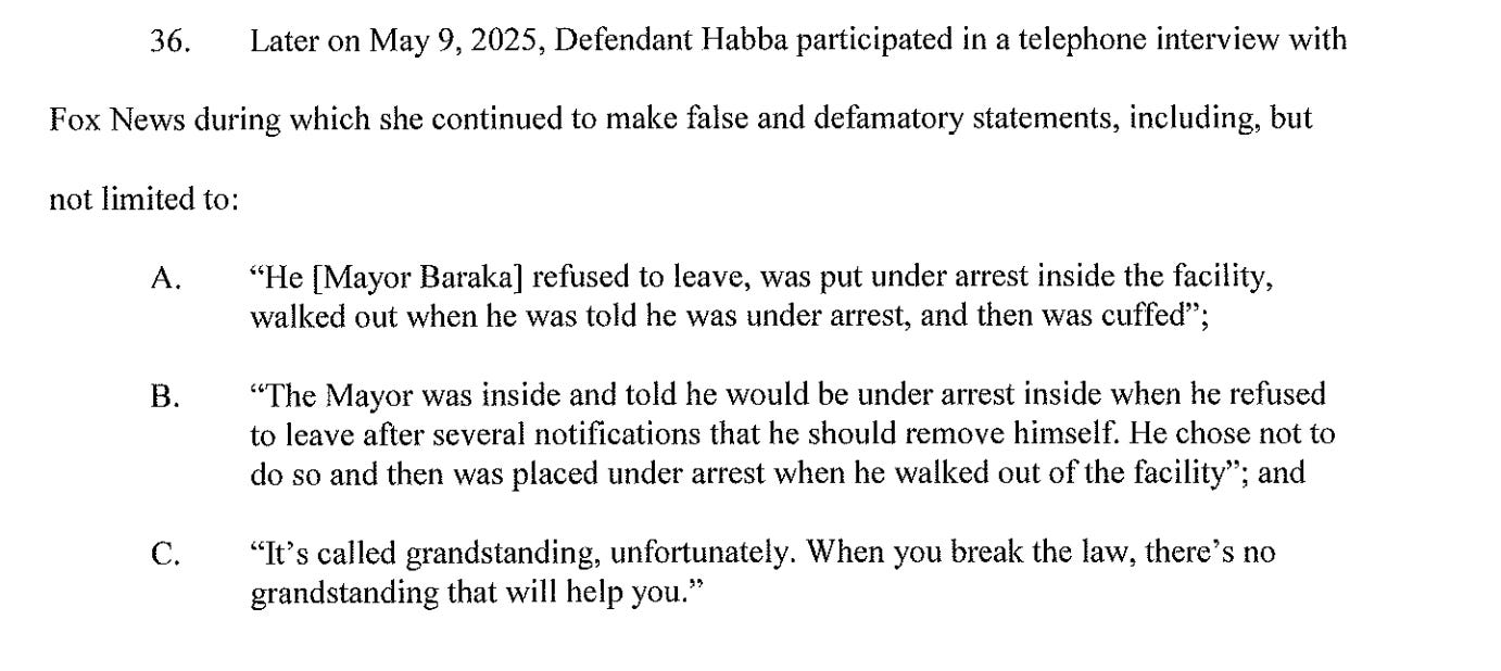 Habba authorized and/or directed his false arrest. Then she issued a defamatory statement about him on her personal social media account, which she and other officials later repeated and augmented on Fox News.
