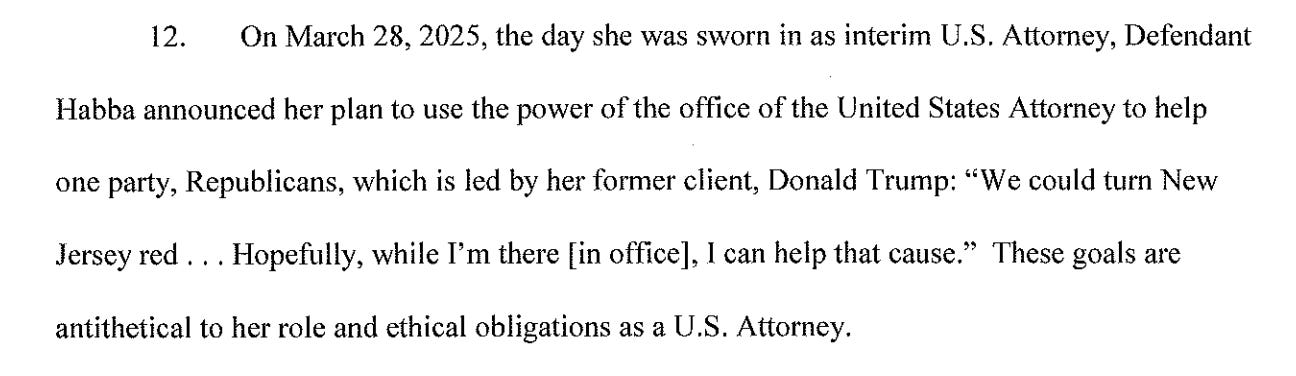 Habba acted for political reasons, fulfilling her goal of “turning New Jersey red.”