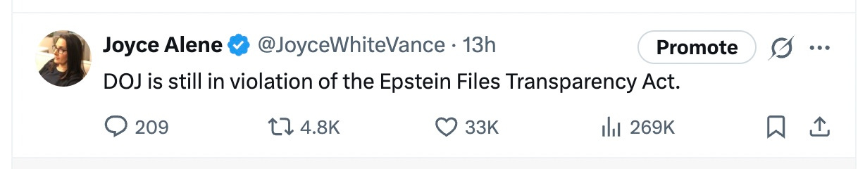 Call me a skeptic, but Saturday was also the 15th day after DOJ’s deadline for complying with the Epstein Files Transparency Act, which means that the Attorney General was required to file a compliance report with Congress, as we discussed in last week’s The Week Ahead column. I haven’t seen that yet. And House Republicans tried to dump the release of the transcript of former Special Counsel Jack Smith’s closed-door testimony on the Hill on New Year’s Eve, hoping it would garner little attention. A foreign military strike and the arrest of that country’s president, however disgraceful he is (and Maduro is a dictator in everything but name), is quite a distraction. And Trump is ever the master of distraction and delay. So let’s make sure we don’t fall for it. I’m more interested than ever in learning what’s in the Epstein Files and seeing Volume II of Jack Smith’s report. They wouldn’t be trying so hard to distract us if it didn’t matter.