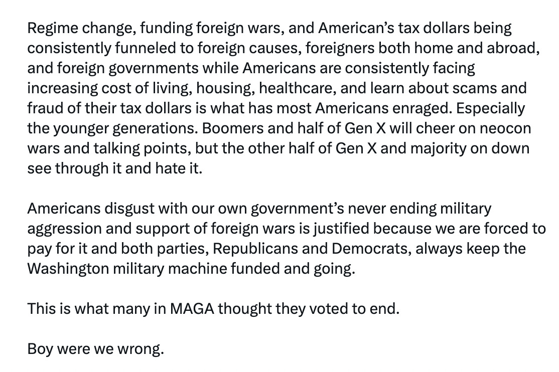 Marjorie Taylor Greene had questions for the administration too. “If U.S. military action and regime change in Venezuela was really about saving American lives from deadly drugs then why hasn’t the Trump admin taken action against Mexican cartels?” she tweeted. She answered her own question, “The next obvious observation is that by removing Maduro this is a clear move for control over Venezuelan oil supplies that will ensure stability for the next obvious regime change war in Iran.”