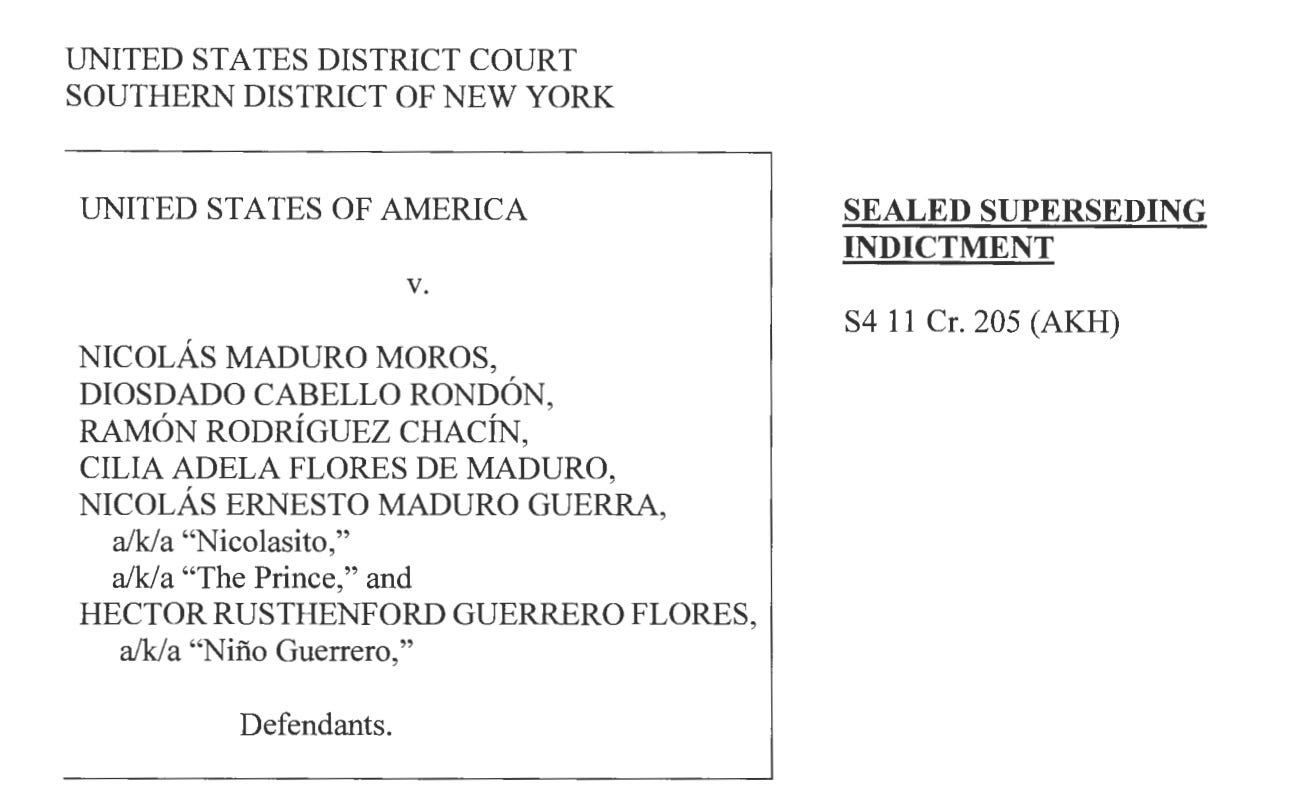 The superseding indictment against Maduro, Flores, and four others was unsealed this morning. It contains three counts and a hefty amount of narrative. It is, as prosecutors say, a speaking indictment: