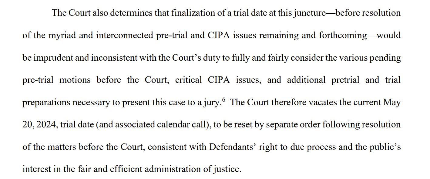 It’s been apparent for months that the May 20 trial date in this case wasn’t going to be the actual start of trial, as the Judge let critical motions stack up and refused to rule. This week, she announced that the trial date was off, and then she refused to set a new one. Special Counsel Jack Smith had asked for a July trial date, but Judge Cannon said it would be “imprudent and inconsistent” with her duty to “fairly consider the various pending pre-trial motions … [and] … critical CIPA issues … necessary to present this case to a jury.”