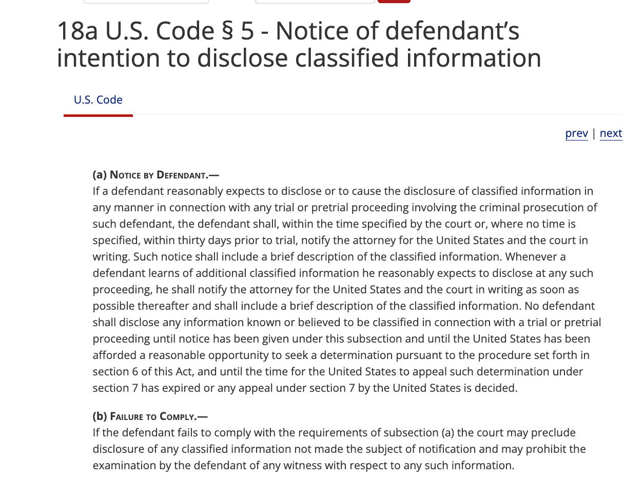 Judge Cannon will finish up with pre-trial motions, if she sticks to her schedule better than she has in the past, by the end of July. She could theoretically get the case ready to go to trial before the election. The reason we know that won’t happen in practice is because of the issues surrounding the use of classified documents at trial. We’ve discussed the statute that governs that process, the Classified Information Procedures Act (CIPA), in the past. A key step in the CIPA process for deciding how to use classified material at trial without endangering national security comes when the defendant files a Section 5 notice. That notice advises the government about what classified discovery a defendant wants to use at trial.