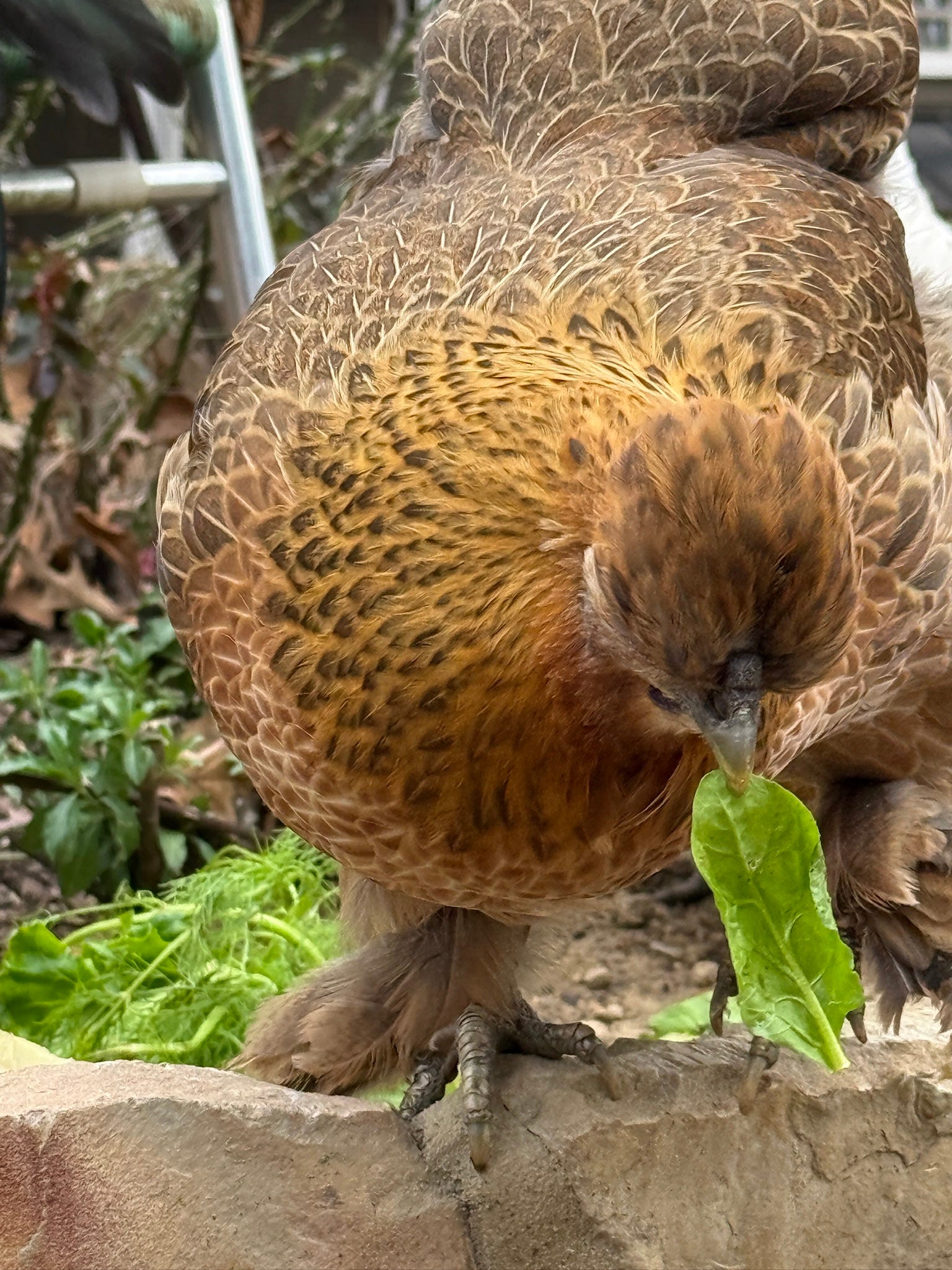 This is our dainty girl, Esther, who likes to take one lettuce leaf at a time away from the picnic table and munch on it before returning for more.