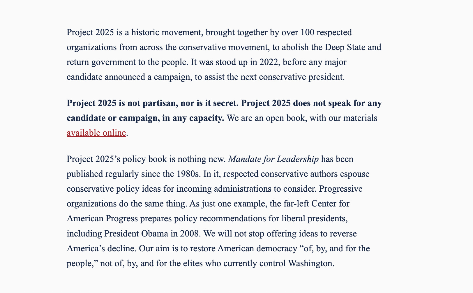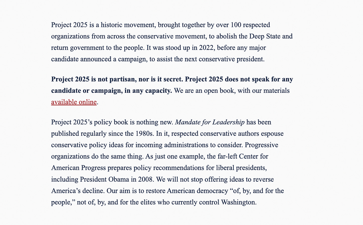 In what appears to be a new page called “The Truth About Project 2025” on the official Project 2025 website, the authors of Project 2025 are explaining themselves. (It’s possible I just hadn’t noticed this page previously, although they Wayback Machine seems to think that it’s new too.)