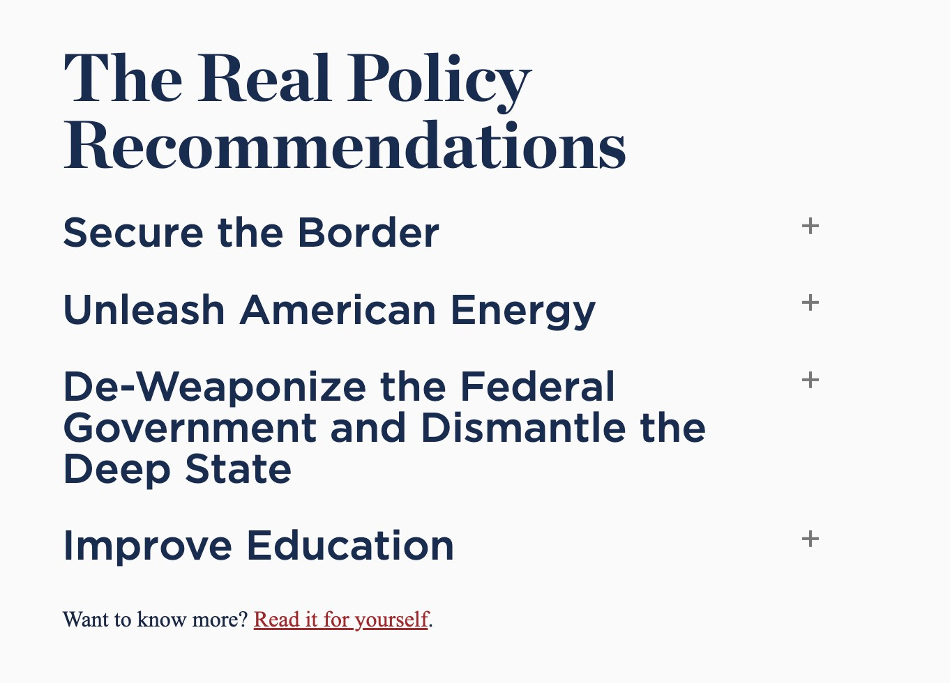You might think that with the director stepping down after Trump demanded it, the website would have disappeared. That’s not the case. The new page kicks off with this claim: “The Left has spent millions fearmongering about Project 2025, because they’re terrified of losing their power. And they should be. Project 2025 offers a menu of solutions to the border crisis, inflation, a stagnant economy, and rampant crime. It shows how we can take on China, fix our schools, and support families. But most importantly, it dismantles the unaccountable Deep State, taking power away from Leftist elites and giving it back to the American people and duly-elected President.”