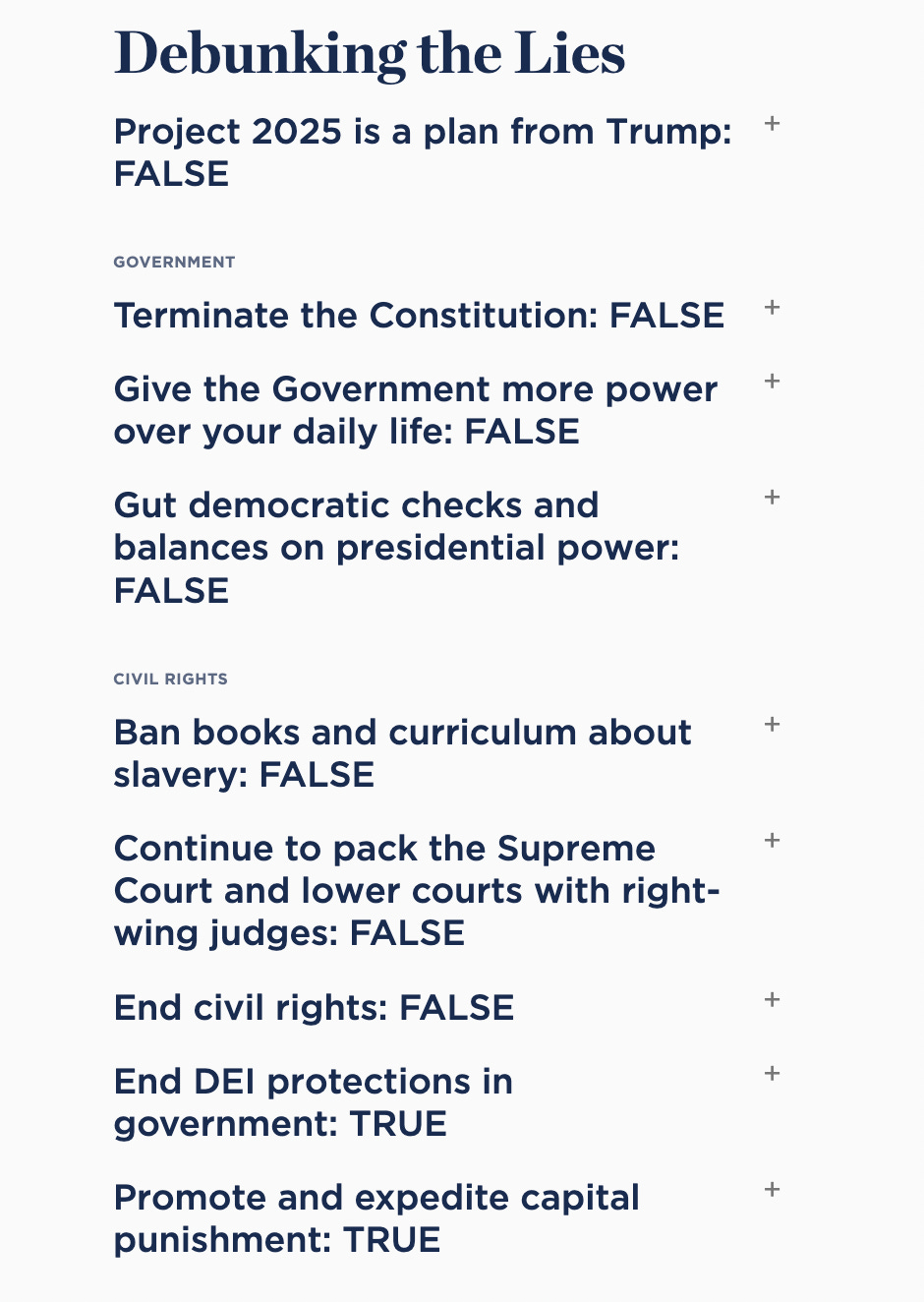 Next comes a table of topics headlined as “debunking the lies” they say have been told about the plan, starting with the claim that it’s false that Project 2025 “is a plan from Trump.” In reality, the list and its contents serve to illuminate still more of the bad stuff embedded in Project 2025.