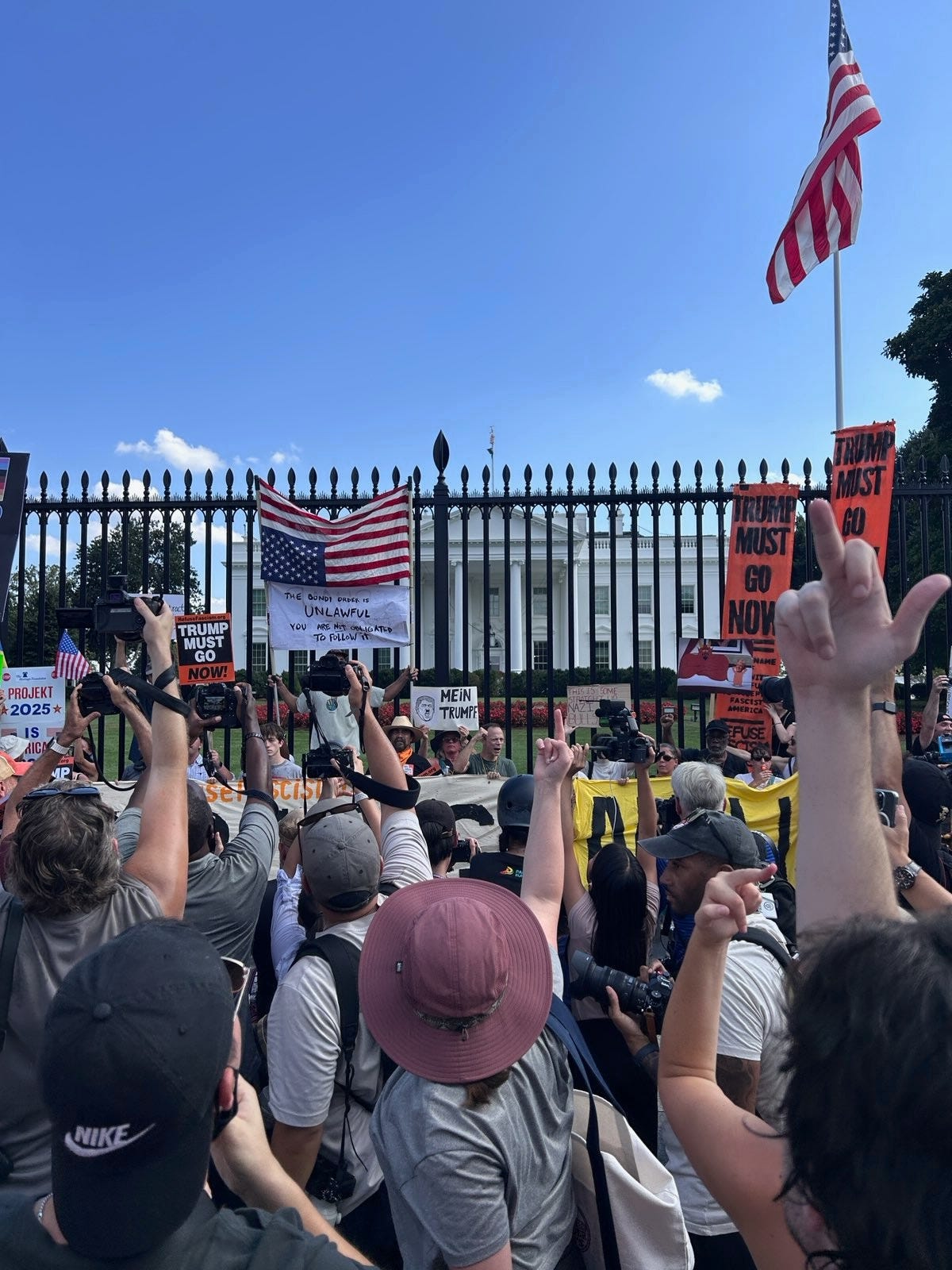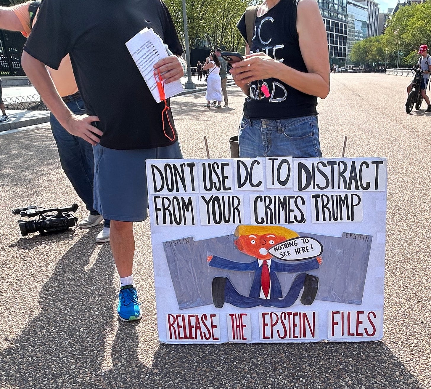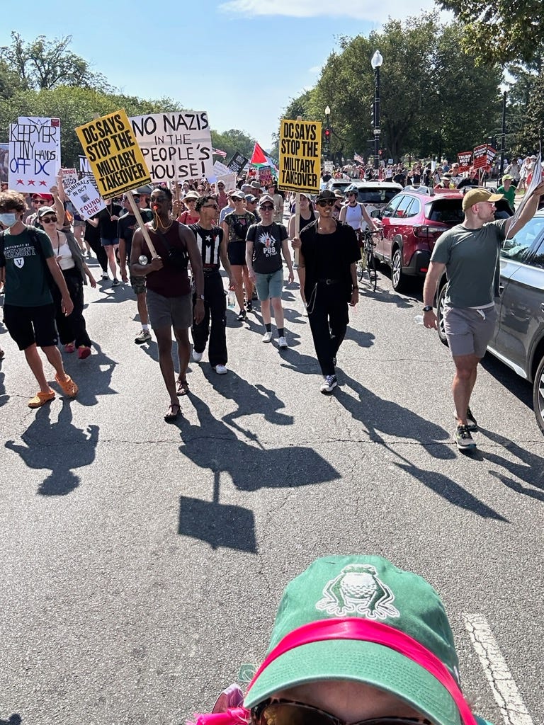 The most important news is that Americans are not giving way to Trump. As the pictures sent to me by protestors show, people were out in the District of Columbia today, refusing to be intimidated by a president who wants to convince us that sending out masked law enforcement agents and armed troops on the streets of the nation’s capital, and any other city for that matter, is within his power. It is not. We will not tolerate his creeping totalitarianism. We are not obligated to accept his power play or make any of this easy for him, as he takes a well-worn page from every authoritarian’s playbook. We are not that country and he is not a king—nor a dictator.