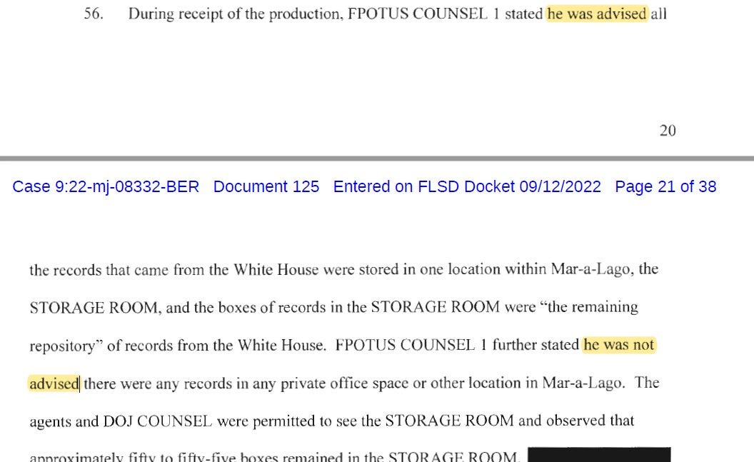 Despite what the government knew about the missing boxes, Trump’s lawyer Evan Corcoran told DOJ "he was advised" all White House records were in the storage room, and "he was not advised" any records were in any of the private spaces where they were ultimately found when DOJ conducted its search. The use of the passive voice here is notable. It theoretically possible someone like Nauta conveyed this information to Corcoran, but in a matter like this, it’s highly unlikely that the lawyer would take the word of anyone other than his client, Donald Trump. Prosecutors most certainly asked Corcoran who told him this when he testified in front of the grand jury in March under a court order.