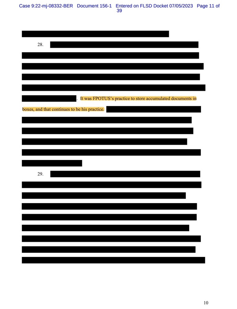 There is a lot that’s still redacted, with intriguing glimpses like the one above into what the government shared with the judge. The government can’t just redact on a whim. It has to show its redactions are narrowly tailored to serve legitimate interests and are the least onerous alternative to sealing the entire affidavit. Here, the judge ruled that the government was entitled to redact portions of the affidavit to "comply with grand jury secrecy rules and to protect investigative sources and methods," which means there is almost certainly some very interesting information still hidden. But we did learn a little bit more in the newly unredacted bits. A lot of it has to do with the allegations about the different ways Trump and his co-defendant, valet Walt Nauta, tried to keep the classified information stored at Mar-a-Lago from coming to light. None of this is groundbreaking, but it does put some interesting flesh on the already meaty bones of the case.