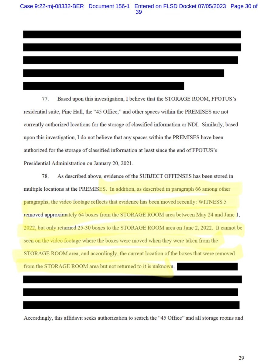 The newly available portions of the affidavit confirm that DOJ became concerned there was more going on than just sloppiness or negligence on Trump’s part after they obtained security camera video from Mar-a-Lago. The video showed Nauta removing boxes from the storage area where Trump acknowledged he’d kept classified documents. The videos, which are mentioned in the indictment, showed that just ahead of a visit to Mar-a-Lago from DOJ officials to take possession of any remaining classified material there pursuant to a subpoena, Nauta removed 64 boxes from the storage area and placed them in various locations within Trump’s residence area. But he returned only 30 boxes. DOJ did the math.