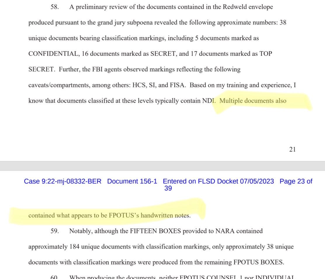 A sentence that was previously redacted at the end of paragraph 58 of the affidavit provided some interesting information. “Multiple documents also contained what appears to be FPOTUS’s handwritten notes.” This means Trump won’t be able to claim he never saw the documents—at best he could maintain the notes were written while he was in office. But if he resorts to that argument, he still has to explain how the documents ended up at Mar-a-Lago after they were in his hands.