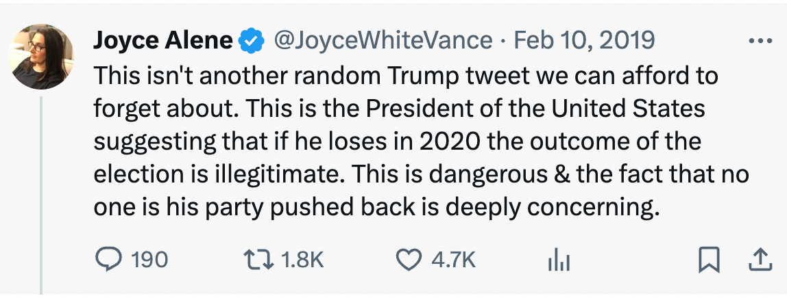 I believe Trump. He will not accept the outcome of the 2024 election if he loses. He will not just fade away. Much like his lawyers told the Supreme Court to expect “bedlam” if Trump was removed from the ballot in Colorado pursuant to the insurrection clause of the 14th Amendment, Trump is telling us to expect bedlam if he loses.