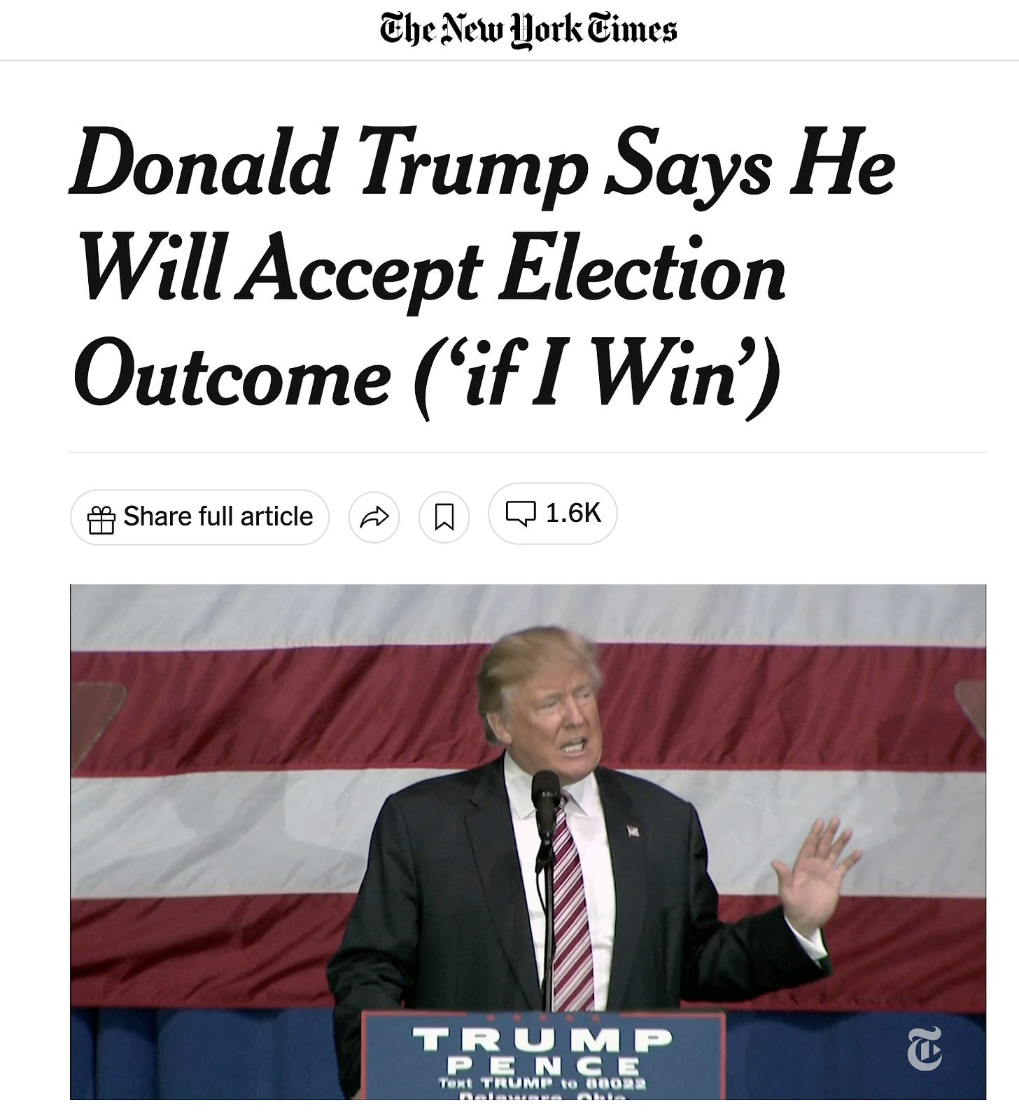 “Ladies and gentlemen, I want to make a major announcement today. I would like to promise and pledge to all of my voters and supporters, and to all of the people of the United States, that I will totally accept the results of this great and historic presidential election IF I WIN.” [The crowd cheered.] “Of course I would accept a clear election result but I would also reserve my right to contest or file a legal challenge in the case of a questionable result. Right?” [More cheers.]