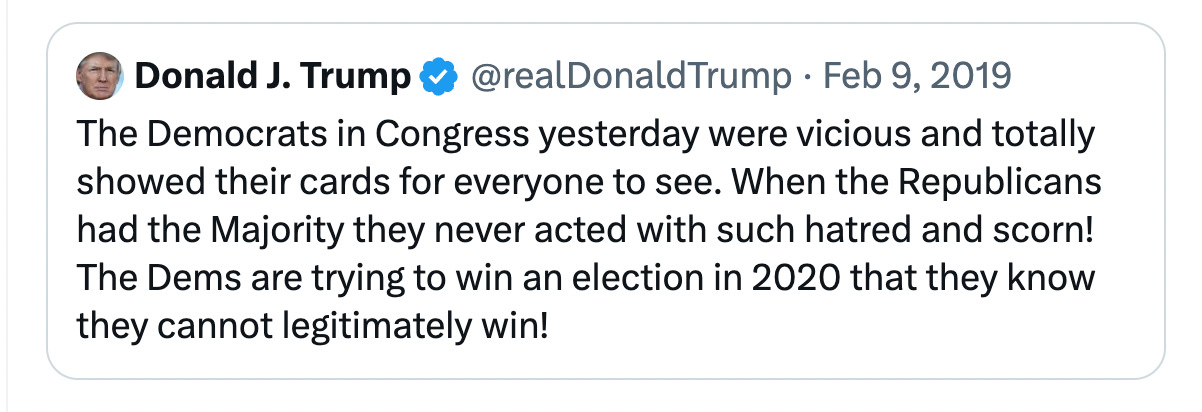 That’s more than a year and a half out from the 2020 election. The Democratic nominee wasn’t even set at this point! And while this might be ambiguous in another context, with Trump, at this point, it wasn’t. “They cannot legitimately win.”