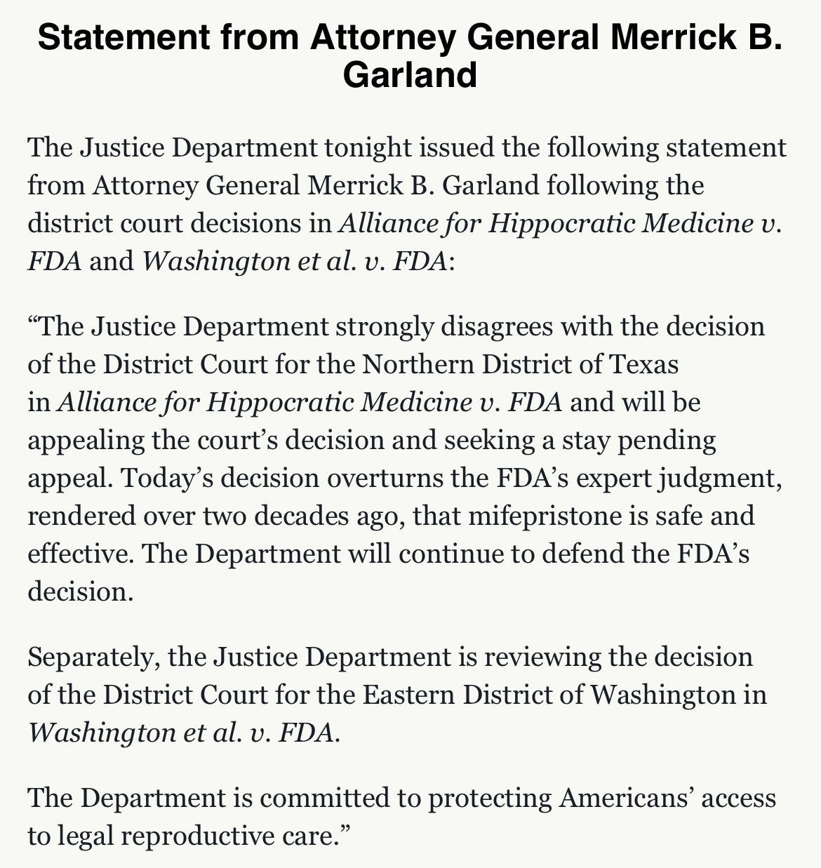DOJ was prepared to file immediately because they understood the inevitable ruling in this case. Judge Matthew Kacsmaryk, who the plaintiffs judge-shopped for by filing this case in the Amarillo division where virtually all cases are assigned to him, has a background of deep antagonism to letting pregnant people make their own decisions. Kacsmaryk’s legal ruling affects the entire country, not just Texas. A federal district judge in Washington State entered a ruling ordering the FDA to keep Mifepristone on the market, just moments after the Texas ruling. But Kacsmaryk entered a nationwide injunction that rescinds the FDA’s approval of Mifepristone nationwide—even in states where abortion is still legal and without exception for the mother’s health.