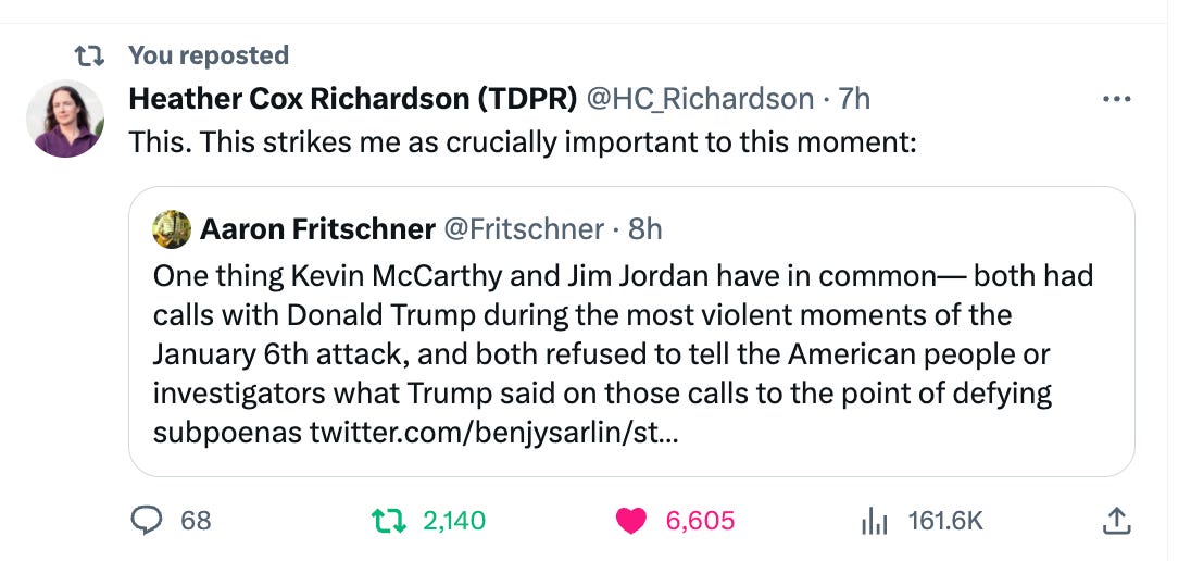 As she does on an almost nightly basis, Heather Cox Richardson, the author of Letters from an American on Substack, cuts to the chase on the demise of Kevin McCarthy’s speakership and the coming race to replace him.